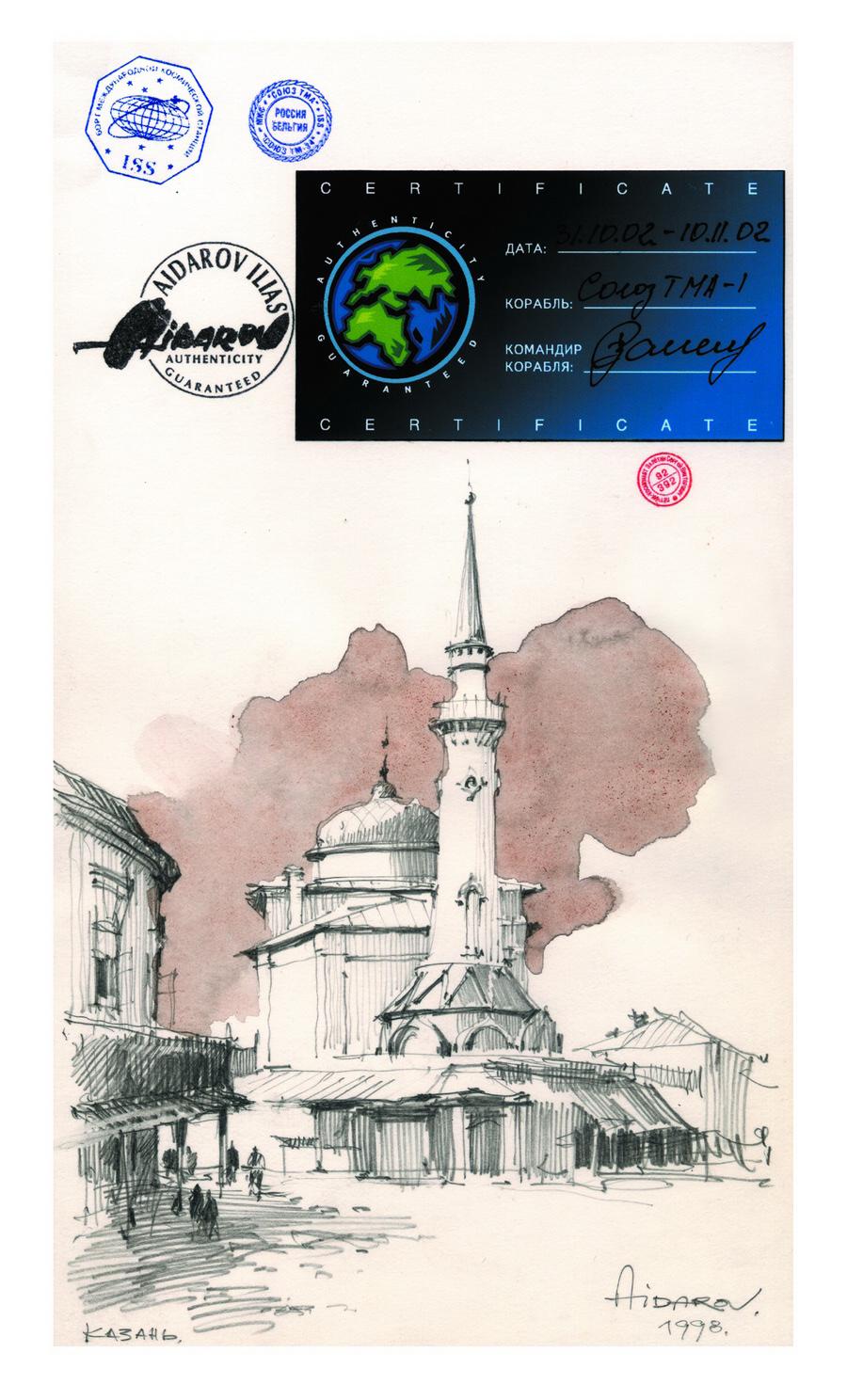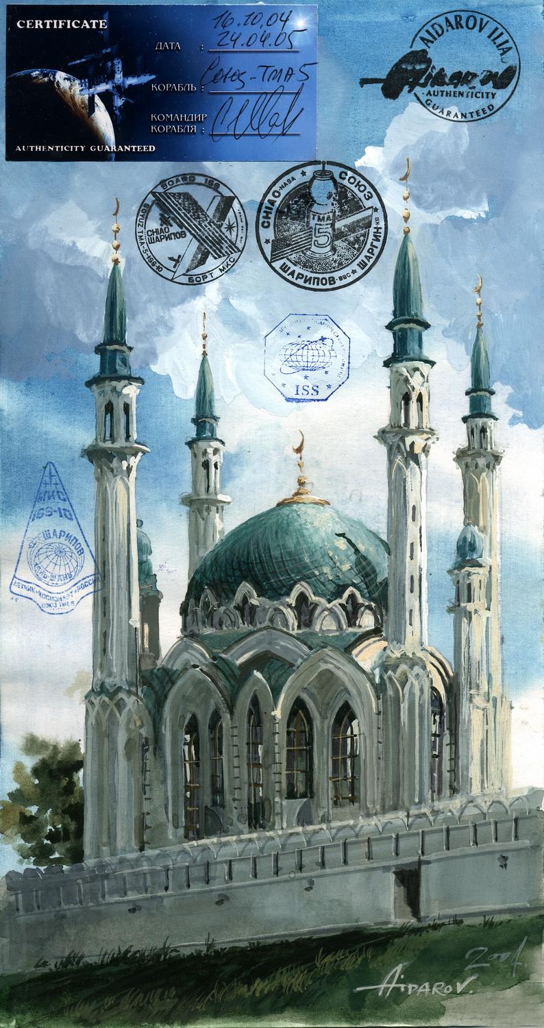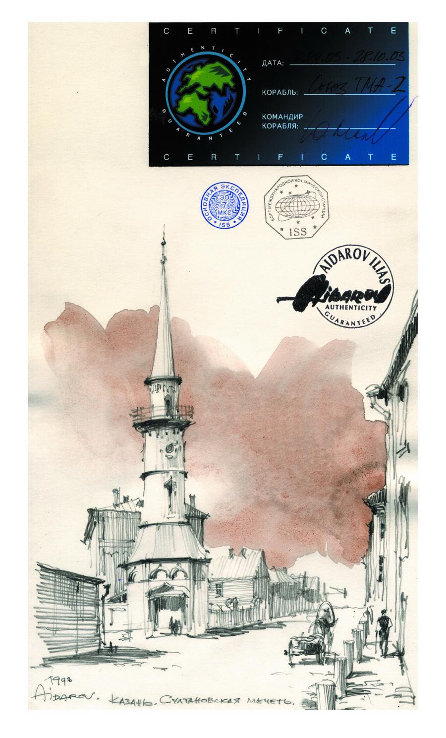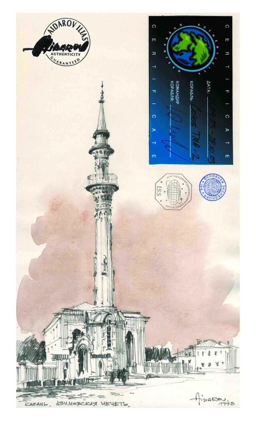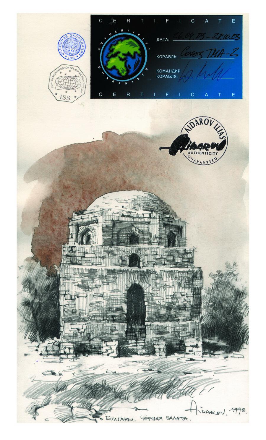 В 2002г. Ильяс Айдаров стал первым в истории человечества художником, которому посчастливелось провести персональную художественную выставку в космосе на борту Международной Космической Станции