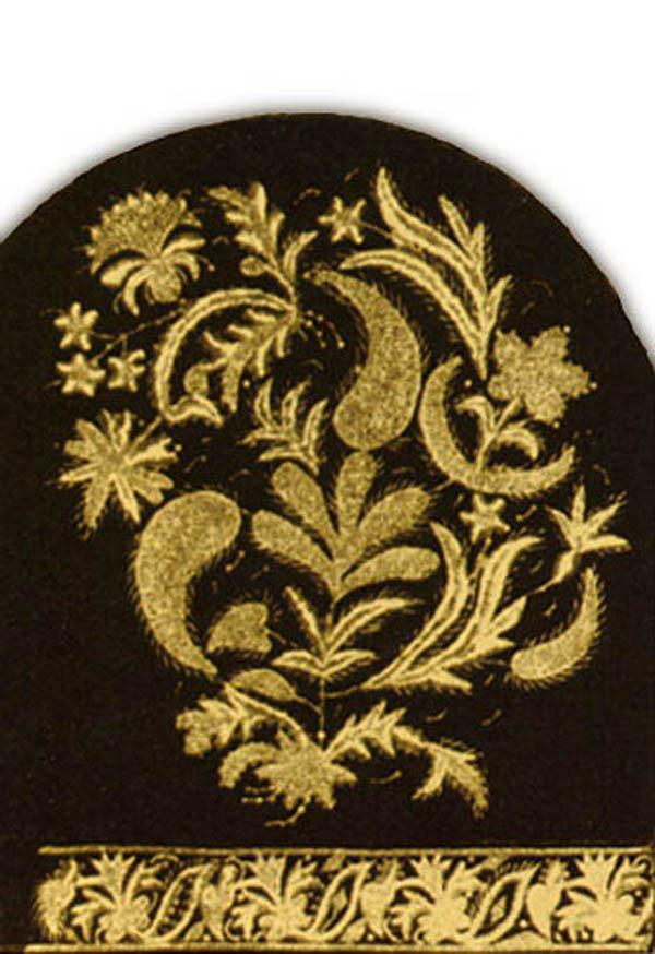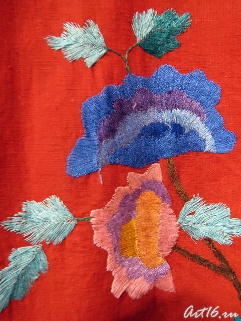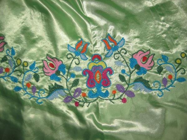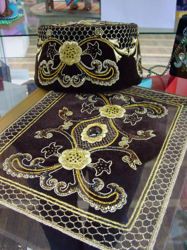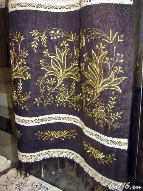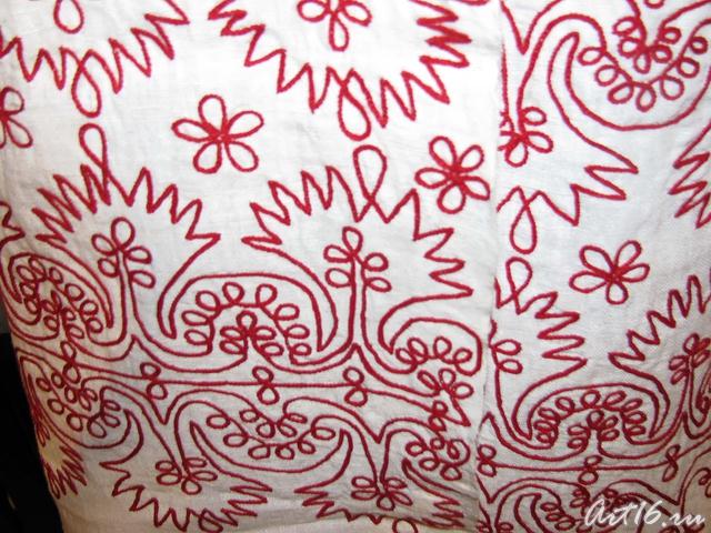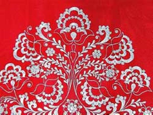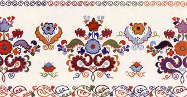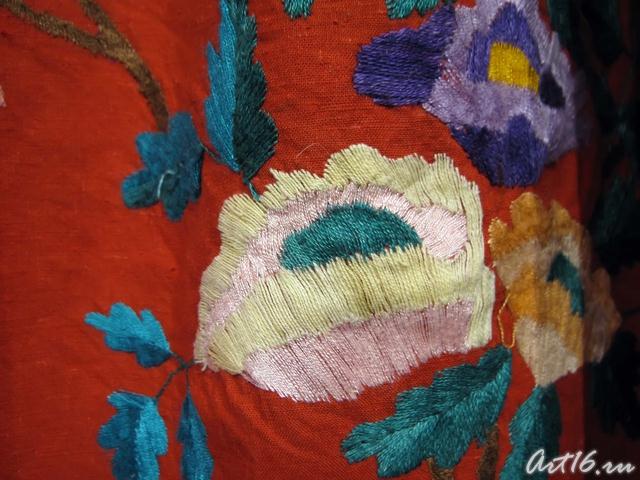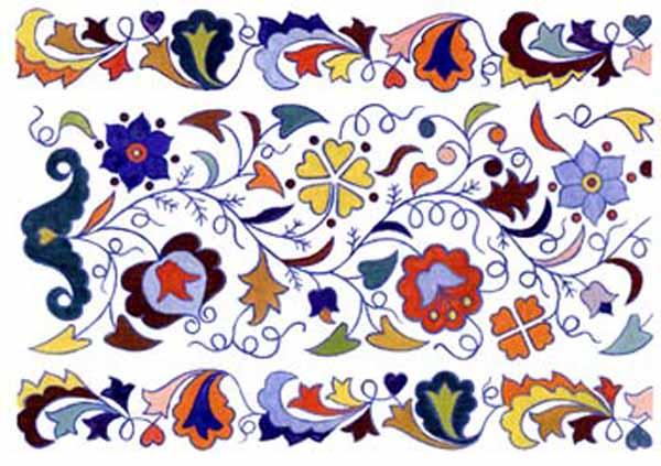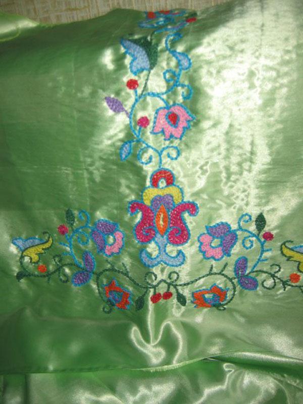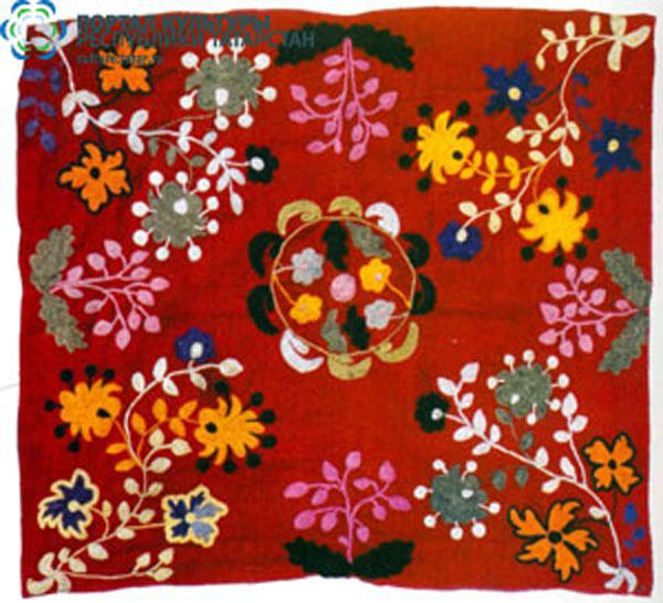 Вышивки по большей части исполняются тамбуром, и композиция узора состоит из мотивов растительного царства, вышивают шелками, золотом, серебром и гарусом. Любимыми тонами являются: зеленые, желтые, синие и красные цвета. Красивы и молитвенные коврики - намазлыки, вышитые гарусом в очень сочных и ярких тонах импрессионистического колорита.