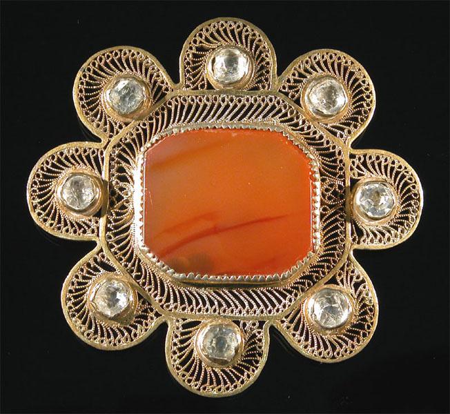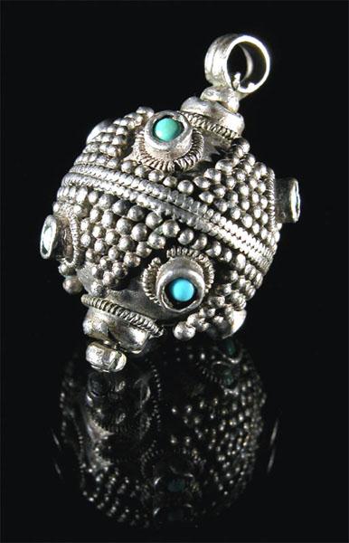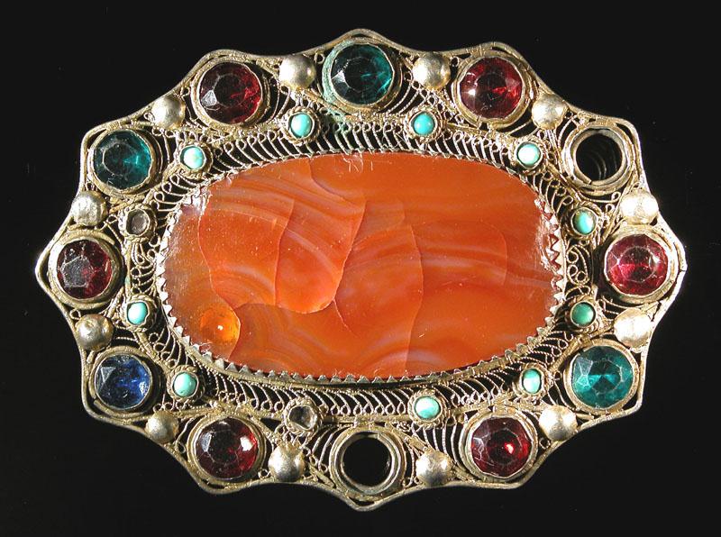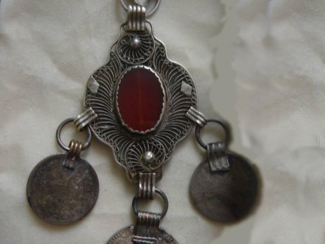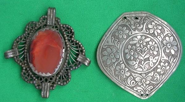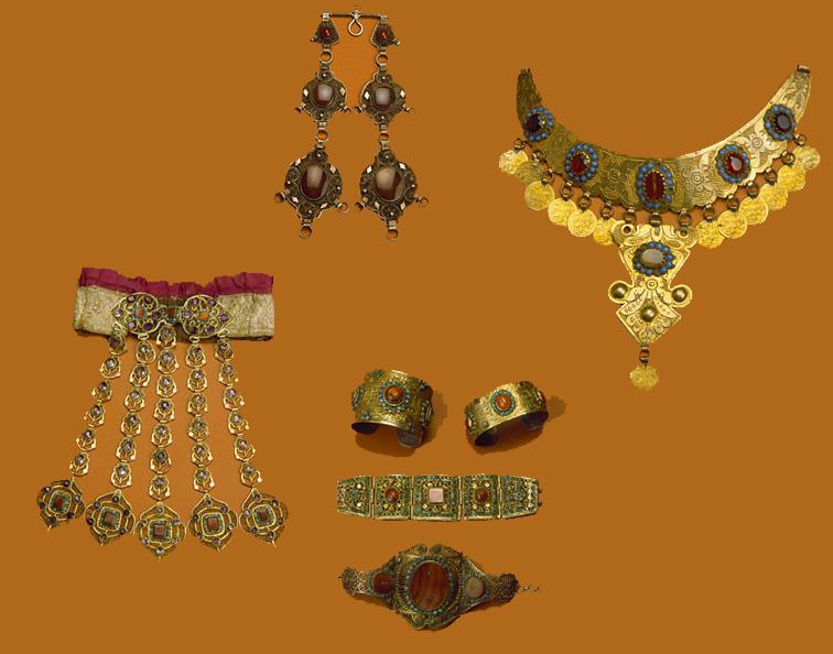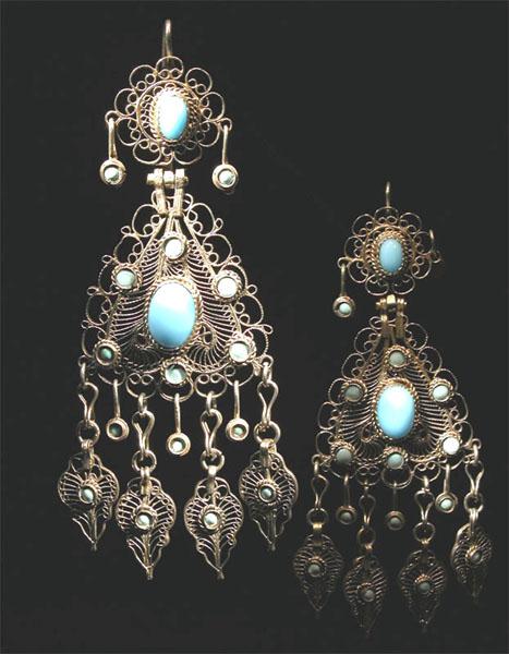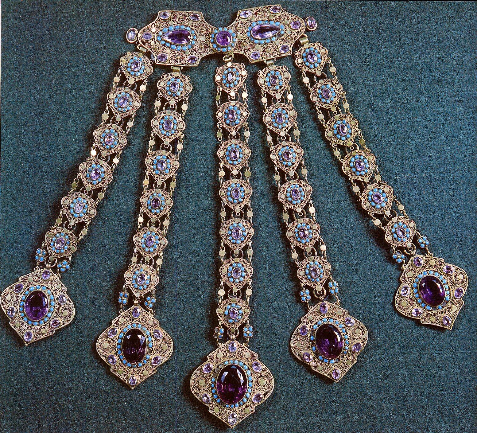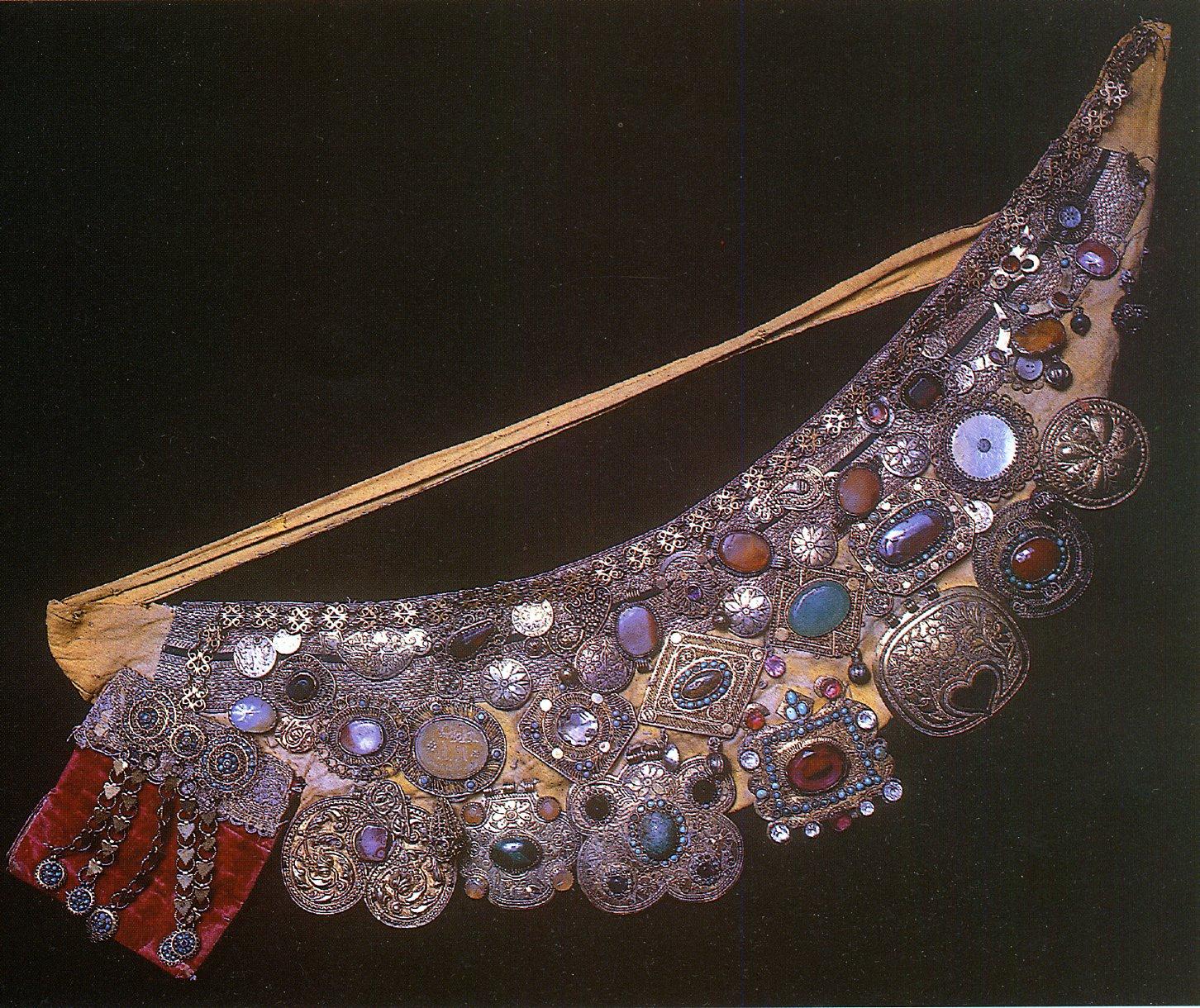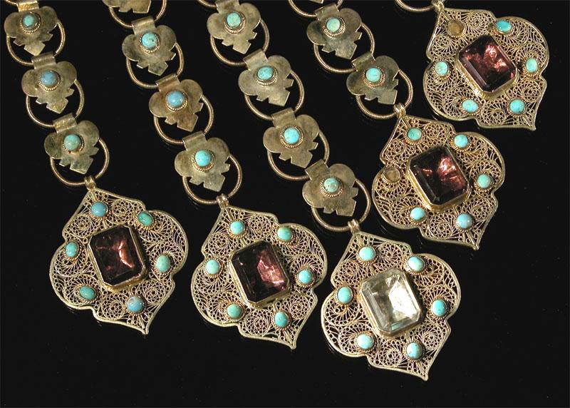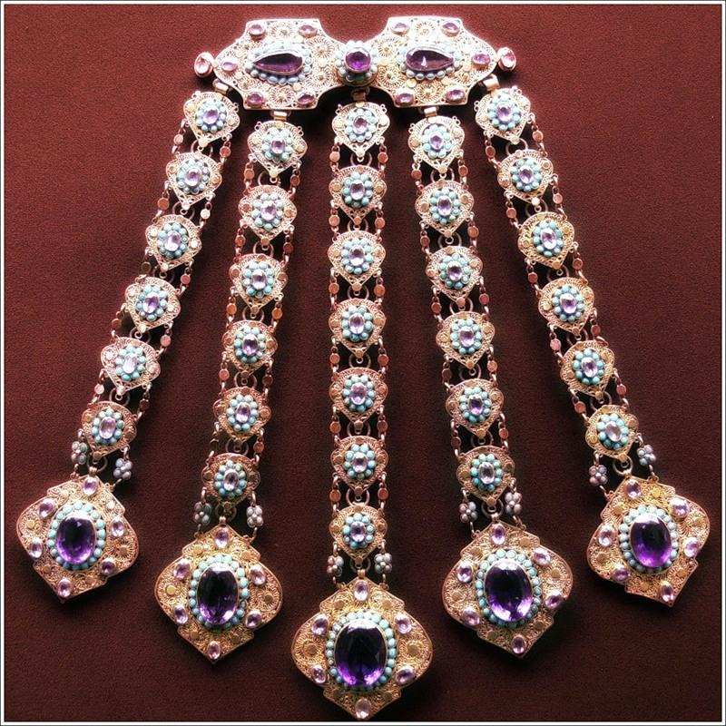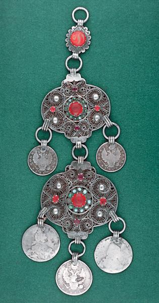 Интересным украшением женского наряда является джиана - чисто ювелирное изделие. Этот предмет представляет собой род воротника, состоящего из двух пряжек-застежек, нашиваемых на особую бархатную ленту, которая одевается на шею. От пряжек книзу идут пять цепочек, заканчивающихся интересными пятью брошками, в центре которых почти всегда бывают дорогие камни, а вокруг тонкая ткань. В большинстве случаев этот наряд бывает очень тонкой, художественной работы из серебра и золота, и он всегда богато украшается камнями, среди которых бирюза является любимым.