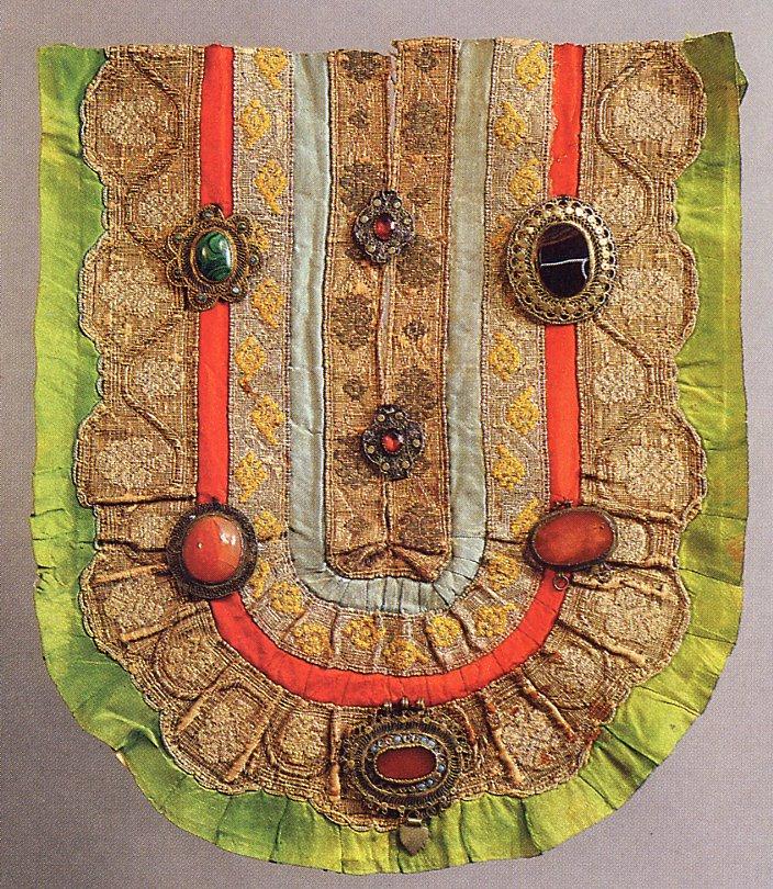 Пышное нагрудное украшение изю, которое нашивается на платье. Представляет собой широкую ленту галуна, унизанную металлическими бляхами, брошками, монетами, самоцветами и бухарскими пряжками. Это украшение носят преимущественно замужние женщины.