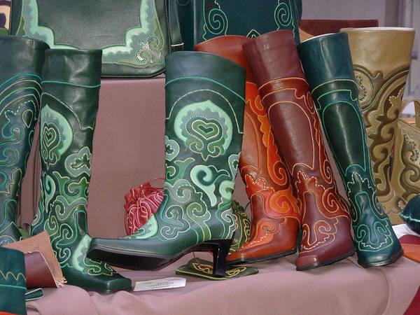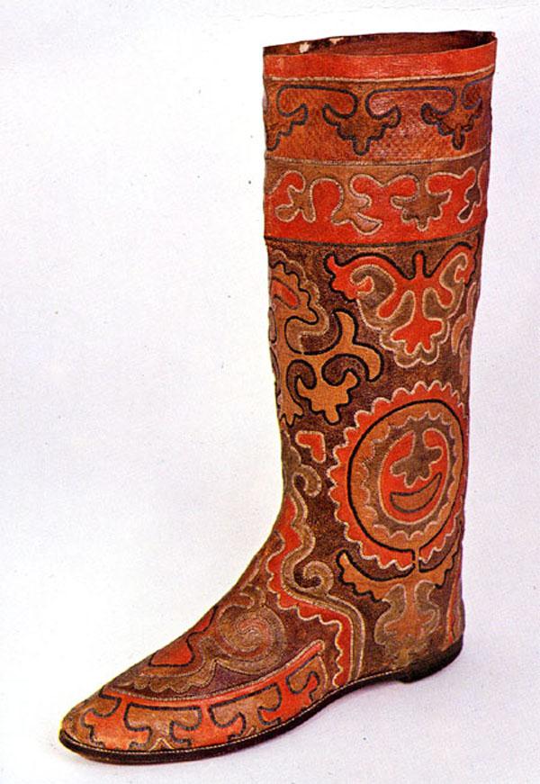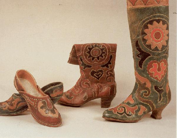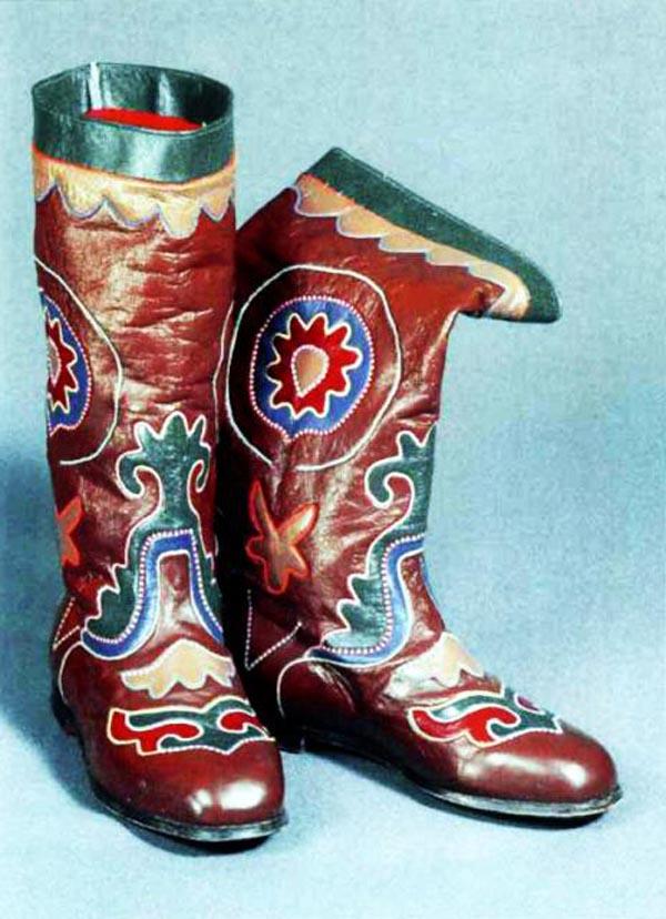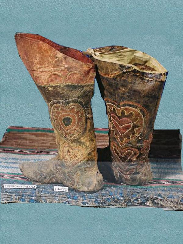 Татарская кожаная обувь, как мужская, так и женская всегда имела живописный характер. Женские туфли были очень любопытны и изящны с узорами цветного сафьяна, вышиты знаменитым татарским швом, украшенным золотом и серебром и часто имитацией жемчуга. Мужские ичиги с узором более грубого рисунка шились из цветных сафьяновых кусков с нарядной отделкой из тесьмы.